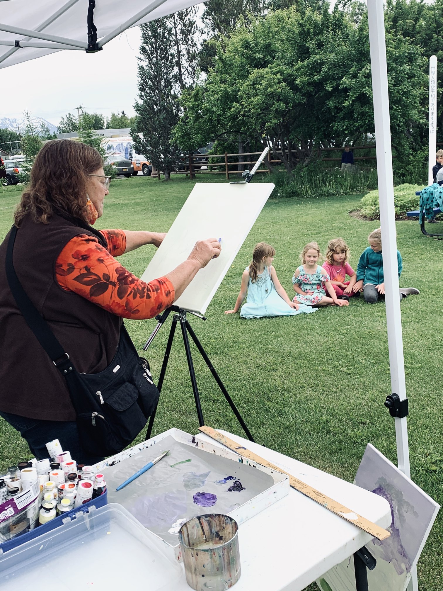 Yeah, I mostly just come up with ideas. With landscapes, you just have to look outside and see the beauty of Alaska and and you know that you don’t have to go far for beautiful landscapes here where we live. But I do love to do portraits. I’m actually in the process of doing portraits of all my nieces and nephews. That’s one of those things. And florals now here with the garden starting. I’ve got a picture of a delphinium for example: my delphinium are just beginning to bloom. I draw inspiration from both nature and just the life around me.